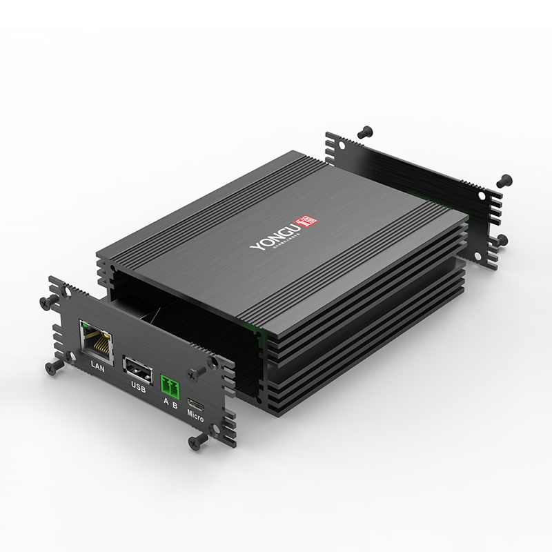 The enclosure is composed of three parts: shell+ front/rear panels+ 8 crews, adopted the AL6063S materials.The internal card slot
