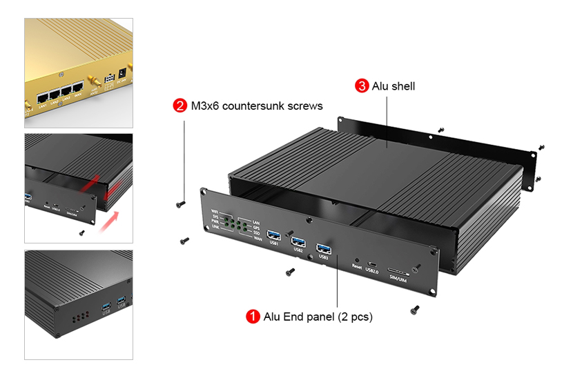 The enclosure is composed of three parts: shell+ front/rear panels+ 8 crews, adopted the AL6063S materials.The internal card slot