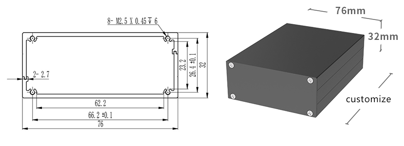 The enclosure is composed of three parts: shell+ front/rear panels+ 8 crews, adopted the AL6063S materials.